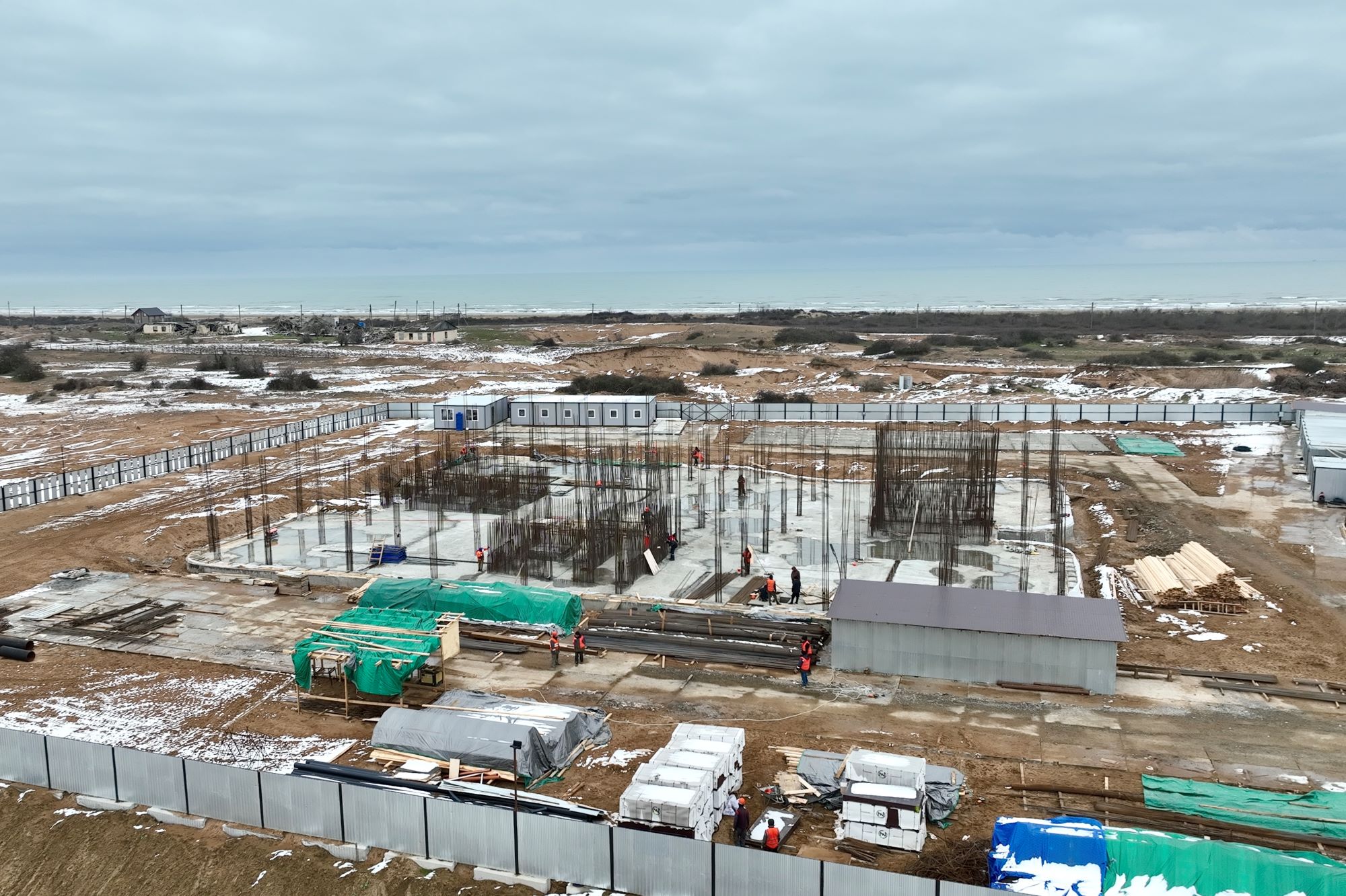 В активной фазе строительства находится смысловое ядро курорта – четырехэтажный многофункциональный центр площадью 7,5 тысяч кв. м. Выполнены земляные работы, завершено бетонирование фундаментной плиты в объеме 1663 м3, проводится устройство гидроизоляции фундаментной плиты, армирование колонн и стен первого этажа, кроме того ведутся подготовительные работы перед заливкой бетона первого этажа.