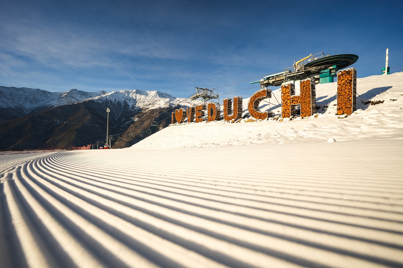 Сейчас на «Ведучи» идут активные строительные работы. Основной фокус внимания на самом сложном строительном объекте курорта — канатной дороге VL1, соединяющей южный и северный склоны. Прямо сейчас строители устанавливают опоры и готовятся к процедуре натяжки каната.